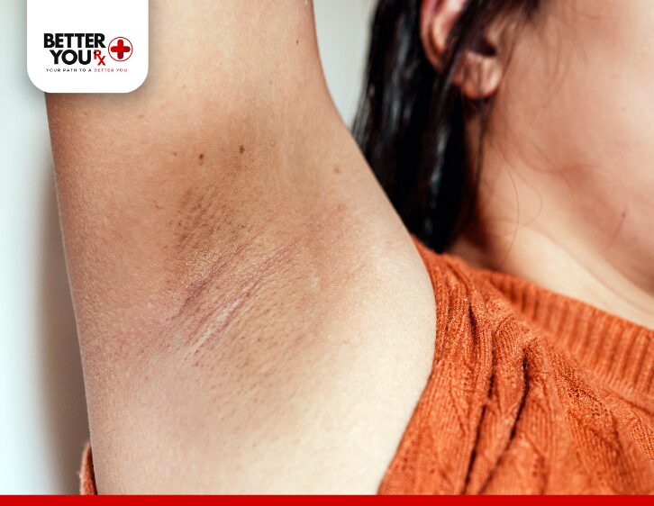 Acanthosis nigricans is a condition characterized by dark, velvety patches of skin, often appearing on the neck, armpits, or groin. These patches may also appear in the elbows, knees, and knuckles. This skin condition is often associated with insulin resistance, which occurs in prediabetes.